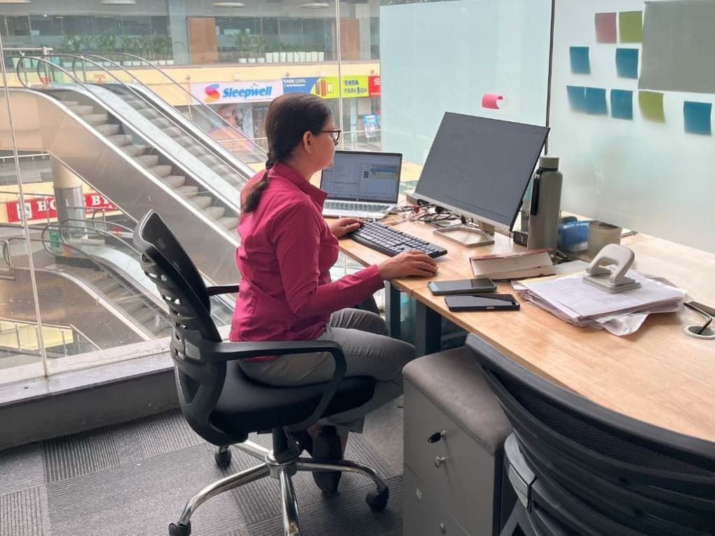 Our India Branch launched its business in a corner of a shared office inside a mall. There is a shopping mall downstairs that sells furniture and other items. The view from our office is very good because of the Atrium and the glass walls, which are typical features of Indian malls and this is my favorite part of the office.